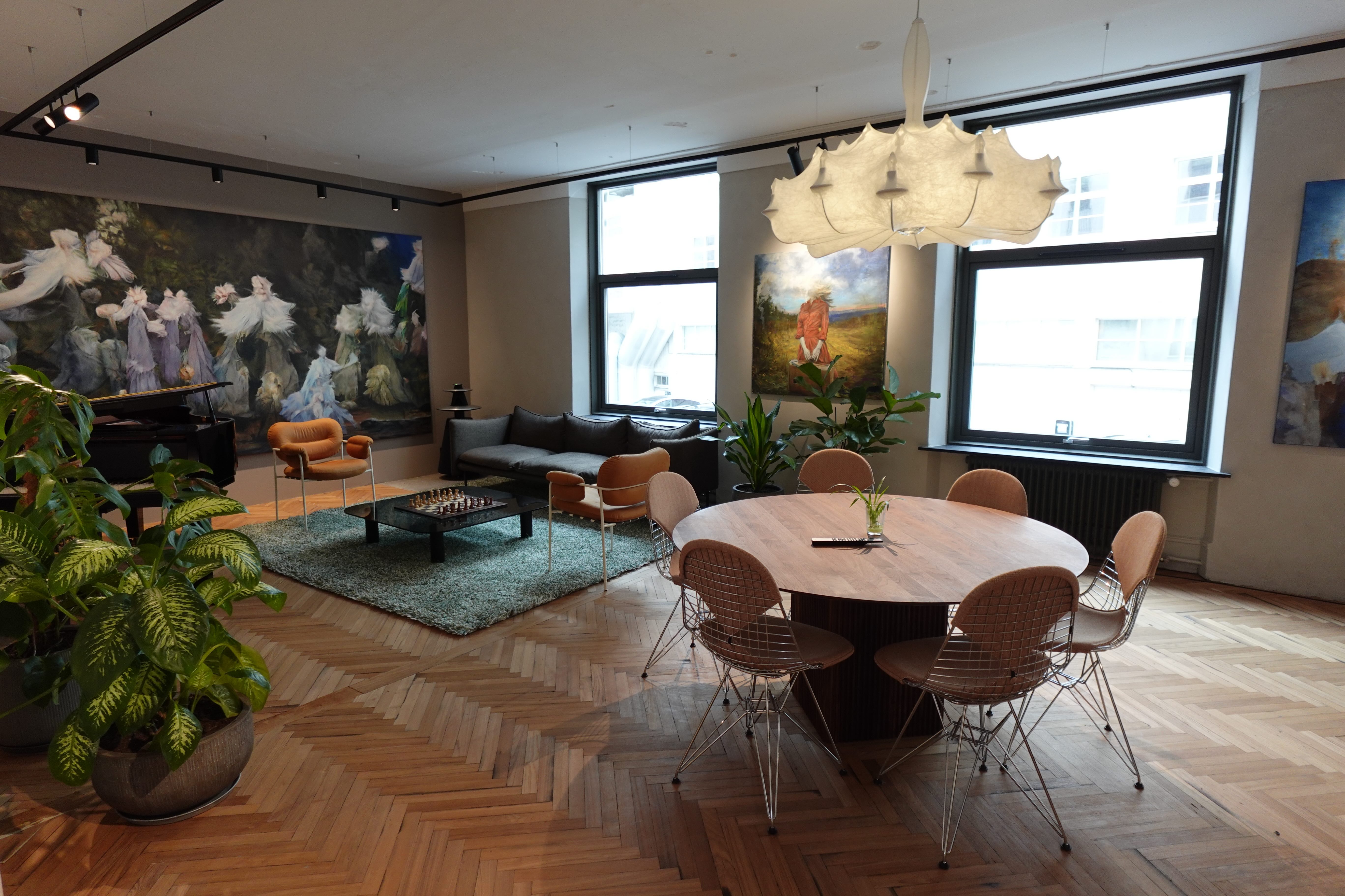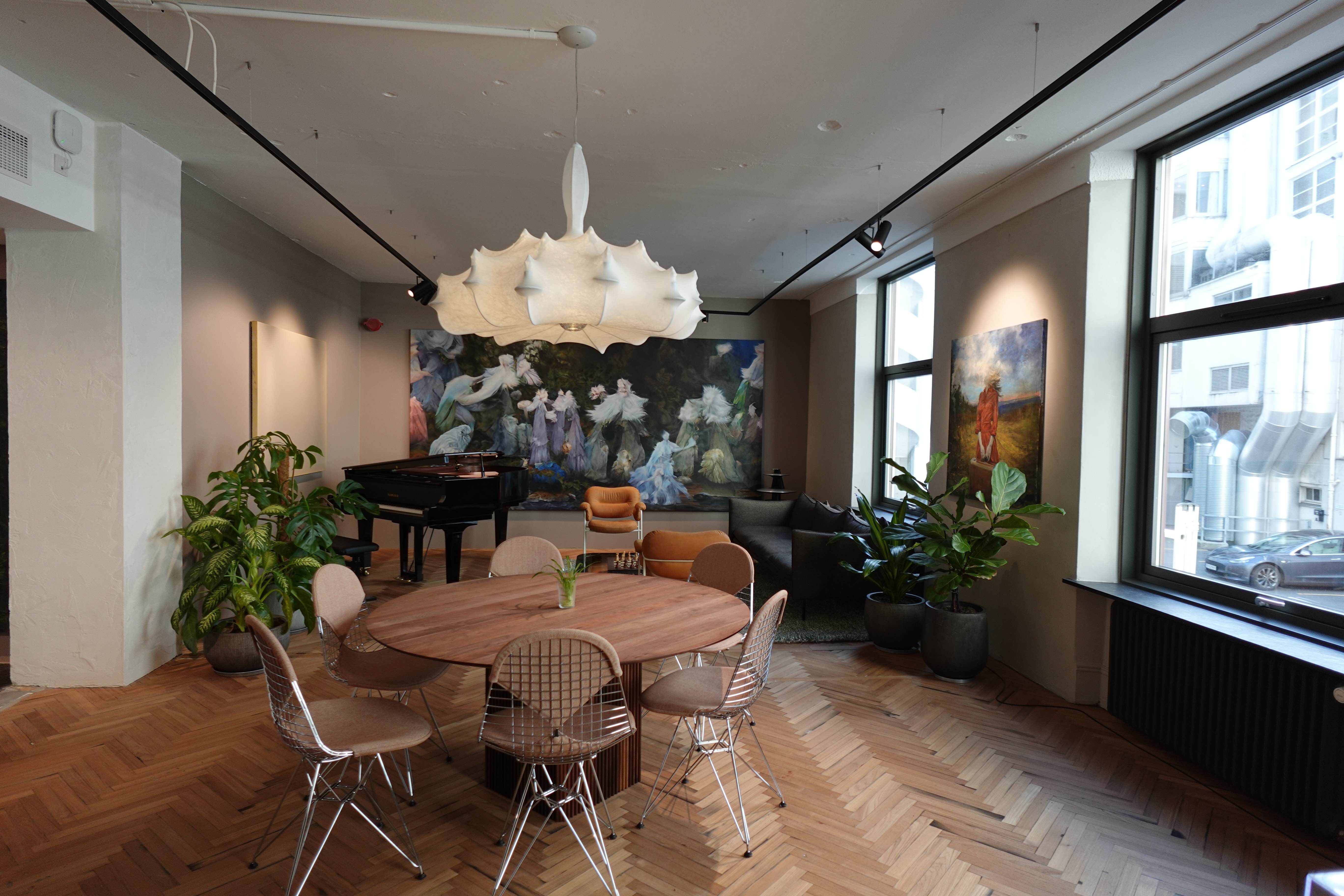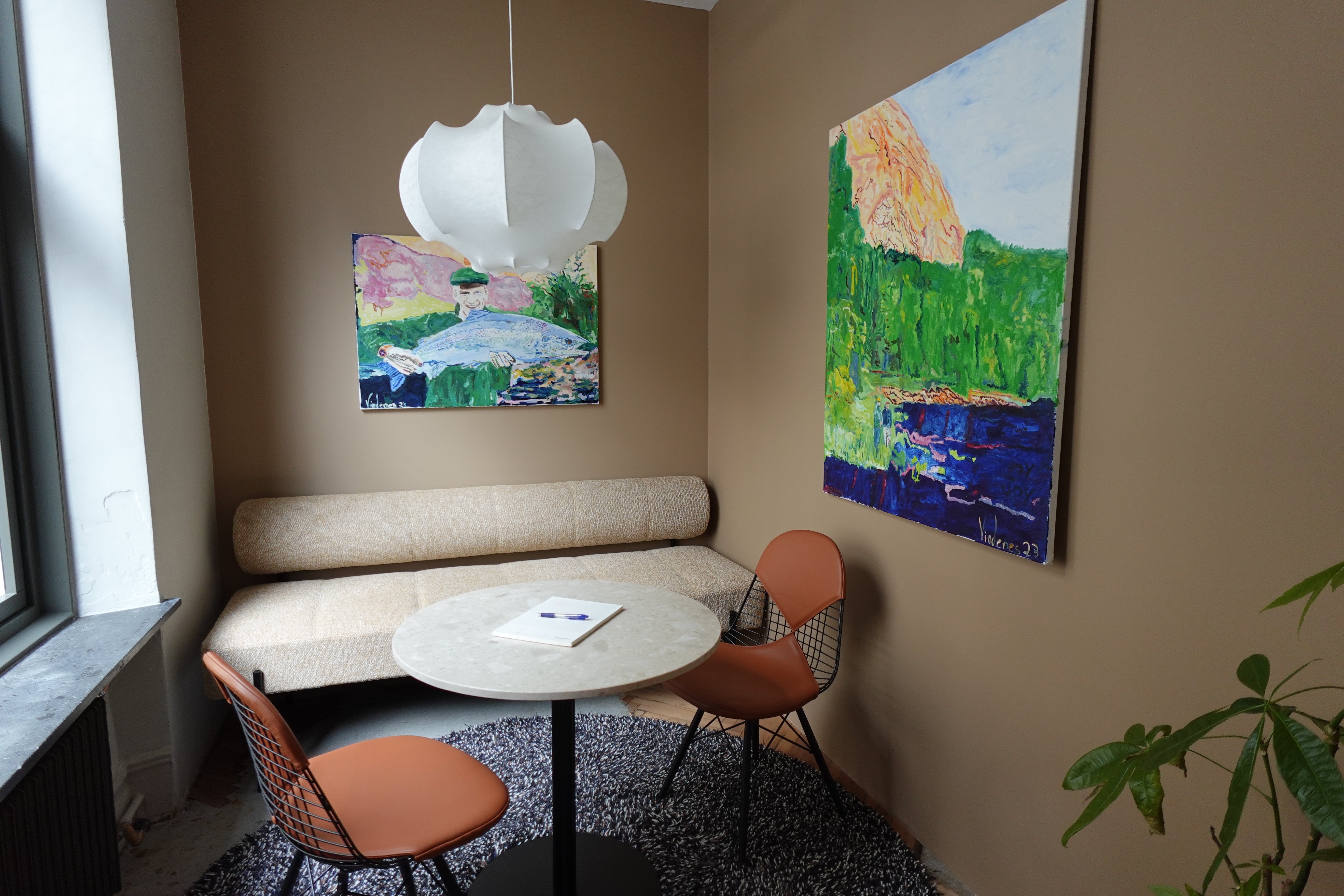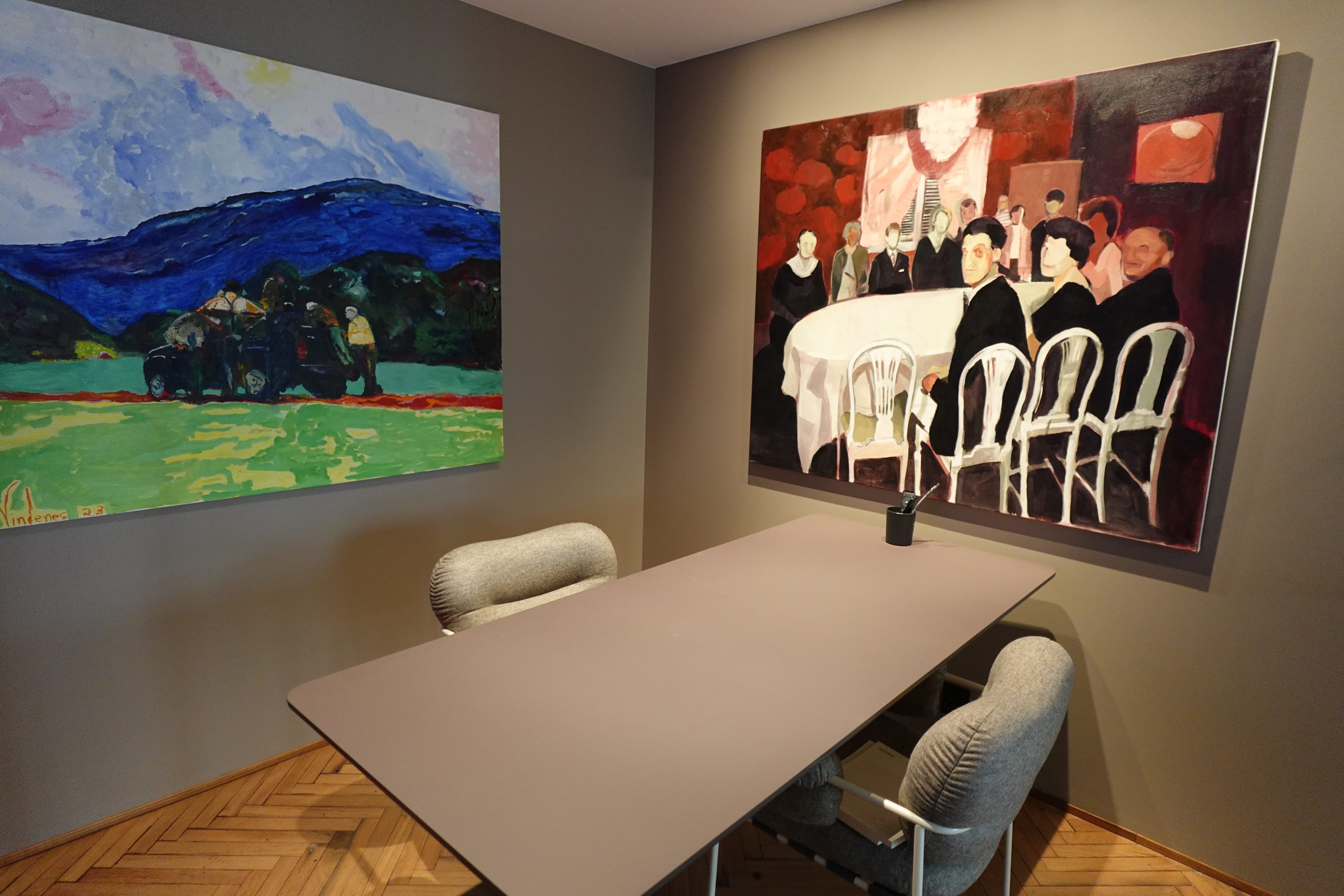 Lokalene våre er innredet for at folk skal elske å være her! Veggene er dekket med kunst, og når flygelet ikke er i bruk, fylles rommene med behagelig jazz fra høyttalerne. (Hva som er behagelig jazz hersker det riktignok en viss intern uenighet om.)