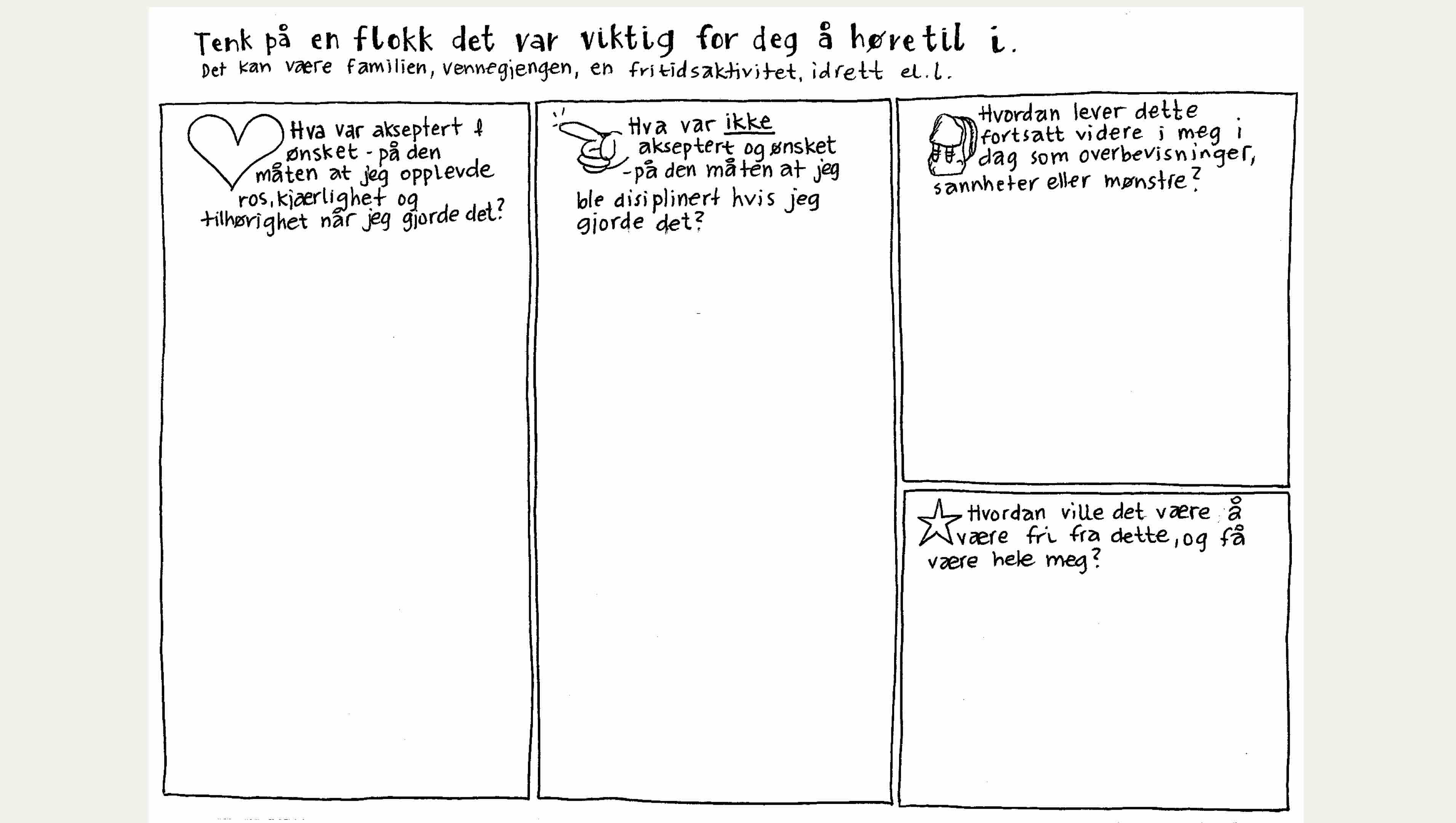 Her får du sjansen til å utforske for din egen del: hvilke ubevisste mønstre har blitt lagret i meg - basert på sider flokken min har heiet på og sider de har disiplinert?