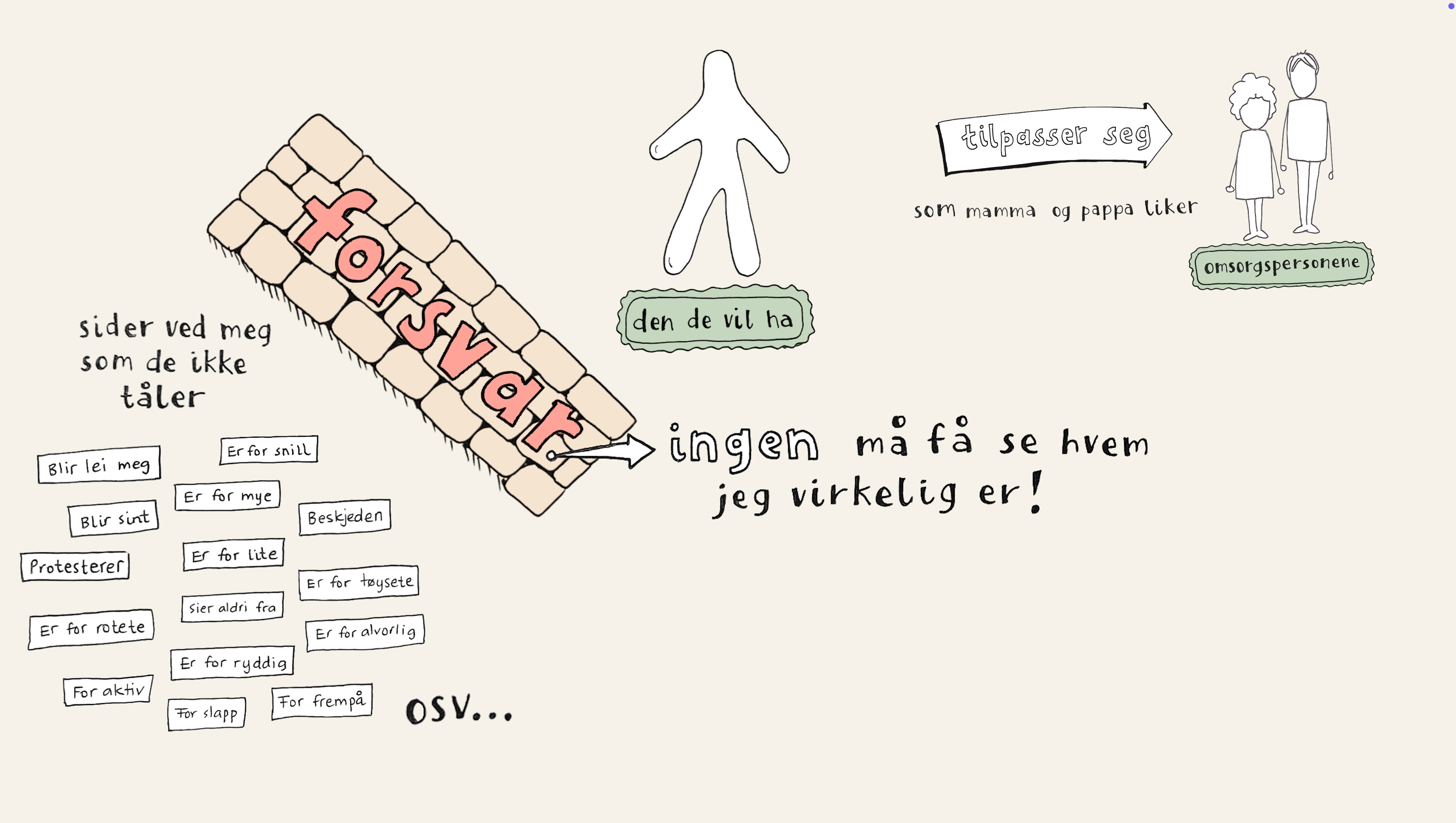 Som barn er vi helt åpne. Vi uttrykker alt vi føler, og søker kontakt med dem rundt oss. Når deler av oss ikke blir møtt eller tålt, lærer vi å tilpasse oss for å bevare tilhørigheten. Vi kan skjule sinne, sorg, frykt eller behov fordi det truer båndet til dem vi er avhengige av.